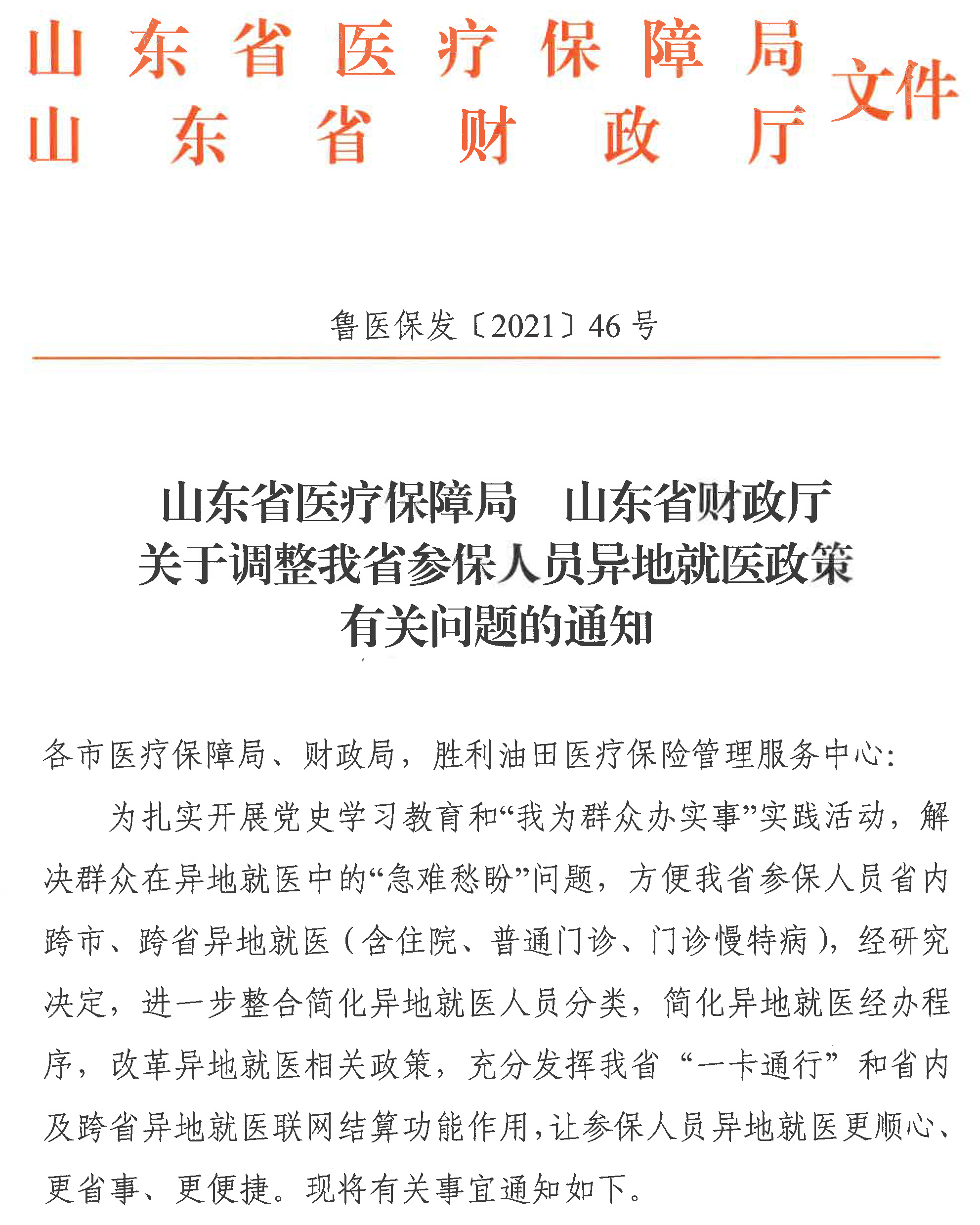 為進一步做好參保人員異地就醫(yī)有關(guān)工作,現(xiàn)將《山東省醫(yī)療保障局山東省財政廳關(guān)于調(diào)整我省參保人員異地就醫(yī)政策有關(guān)問題的通知》(魯醫(yī)保發(fā)〔2021〕46號)轉(zhuǎn)發(fā)給你們,并提出如下要求,請一并貫徹執(zhí)行。