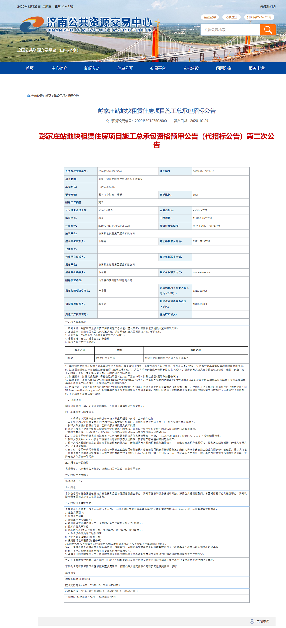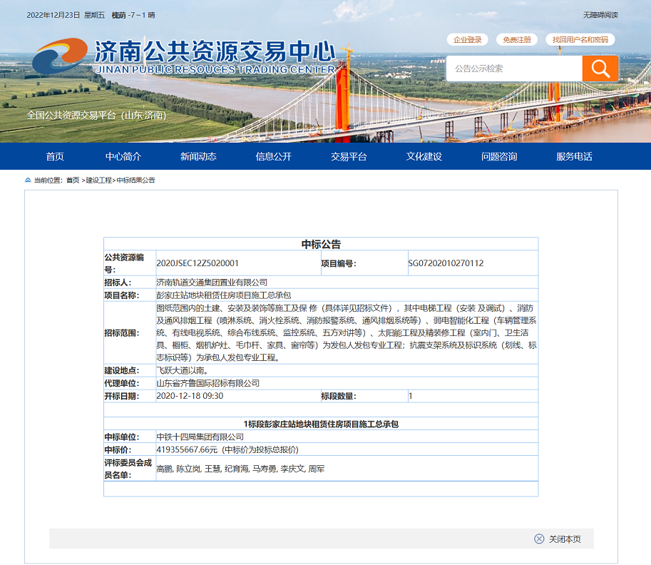 【招標投標信息】彭家莊站地塊租賃住房項目施工總承包招標投標信息 發(fā)布日期:2022-09-26 14:29 信息來源:濟南市政府門戶網(wǎng)站 瀏覽次數(shù):次 字體:【 默認 大 超大 】 招標公告:中標結果公示: 【打印本頁】 【關閉窗口】