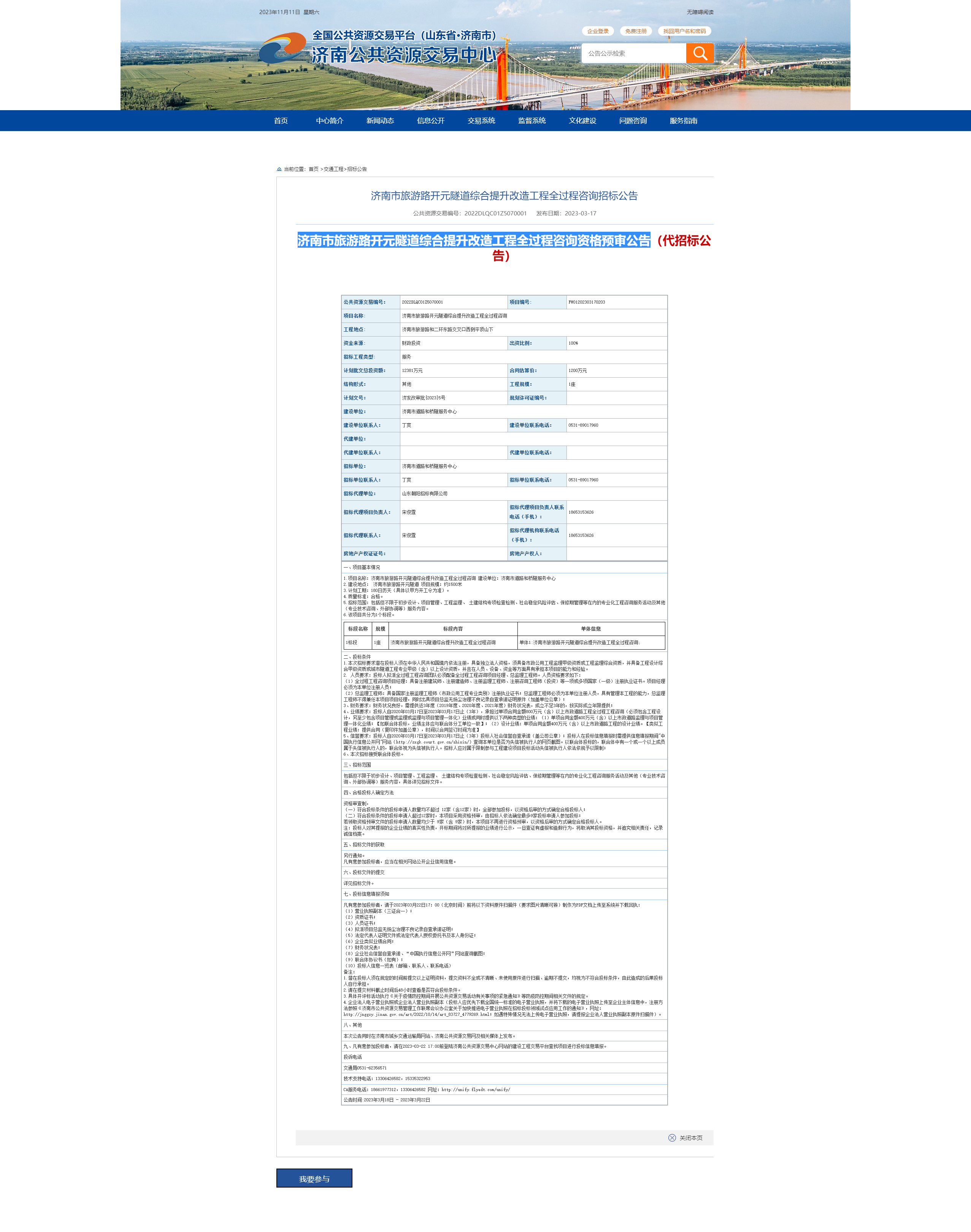 2、濟(jì)南市旅游路開元隧道綜合提升改造工程全過(guò)程咨詢招標(biāo)信息