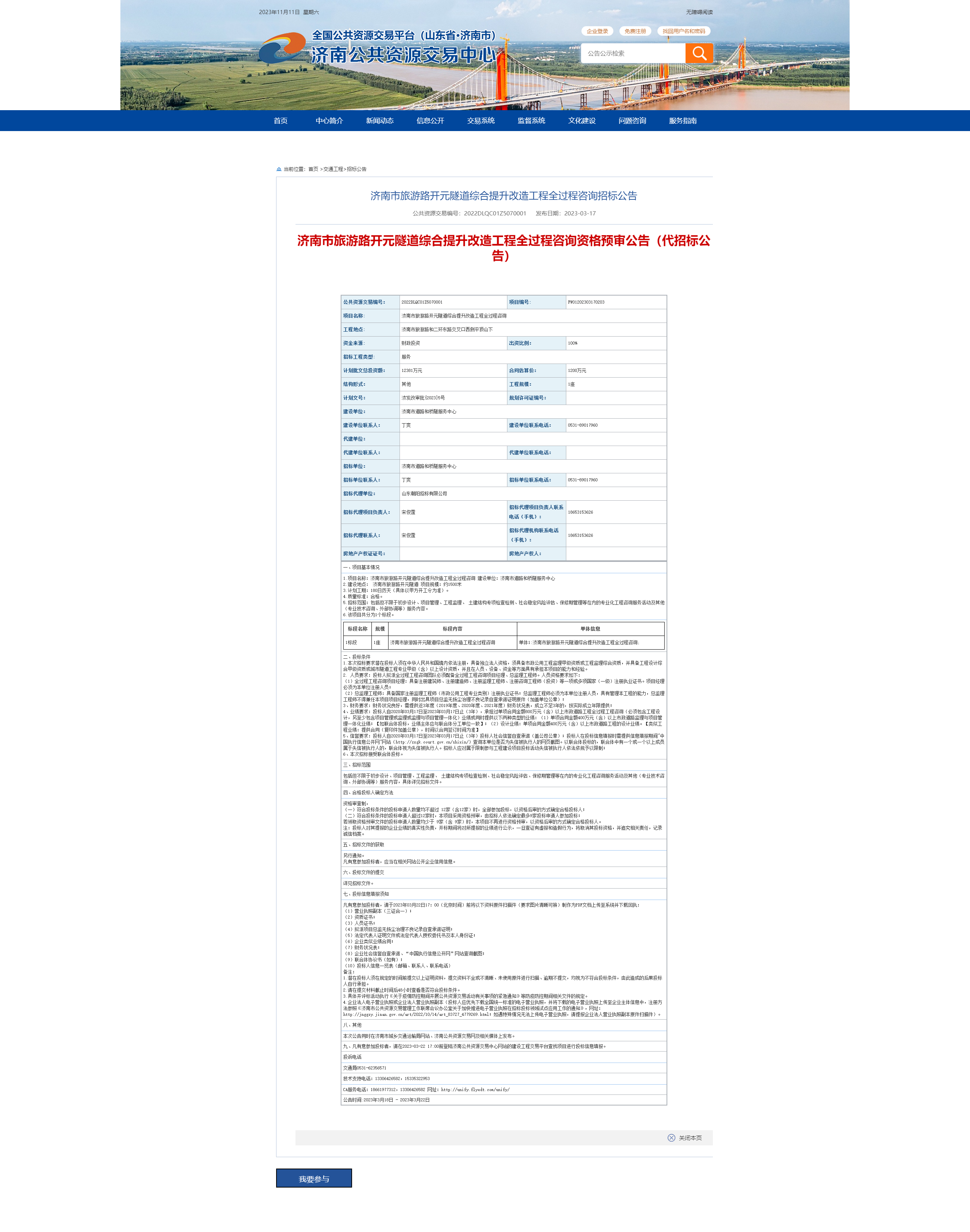 (1)濟(jì)南市旅游路開元隧道綜合提升改造工程全過(guò)程造價(jià)咨詢服務(wù)資格預(yù)審公告(代招標(biāo)公告)