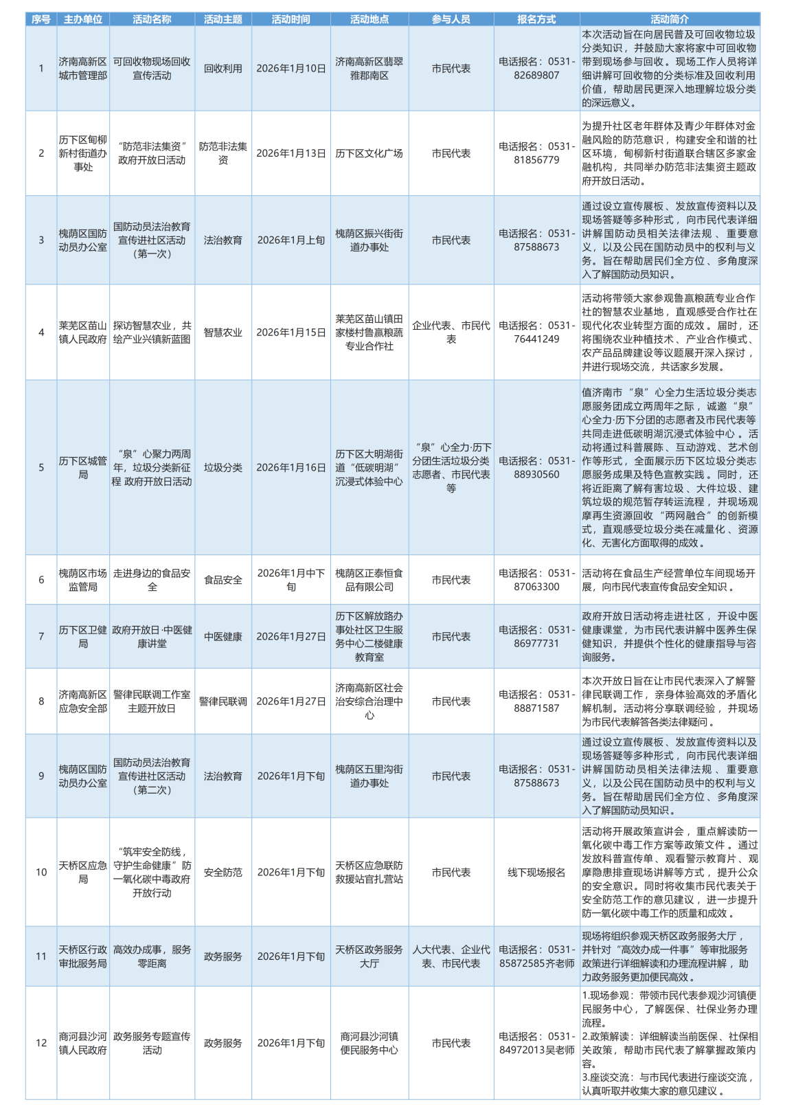 濟(jì)南市2026年1月將舉辦“泉誠(chéng)公開(kāi) 政府開(kāi)放”系列活動(dòng),涵蓋回收利用、智慧農(nóng)業(yè)、垃圾分類、食品安全、中醫(yī)健康、政務(wù)服務(wù)等領(lǐng)域,歡迎您來(lái)參加。
