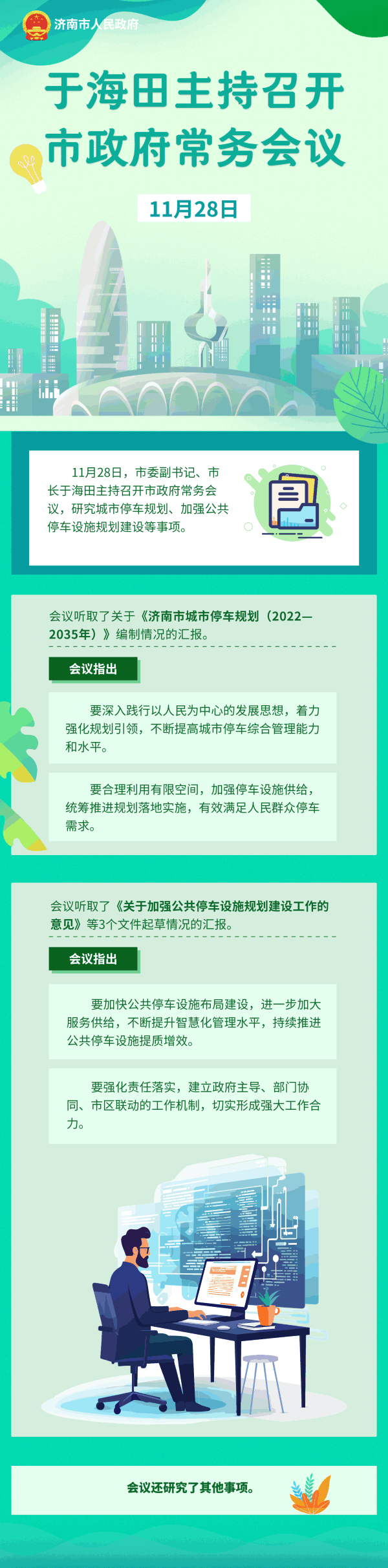 11月28日,市委副書記、市長于海田主持召開市政府常務會議,研究城市停車規(guī)劃、加強公共停車設施規(guī)劃建設等事項。
