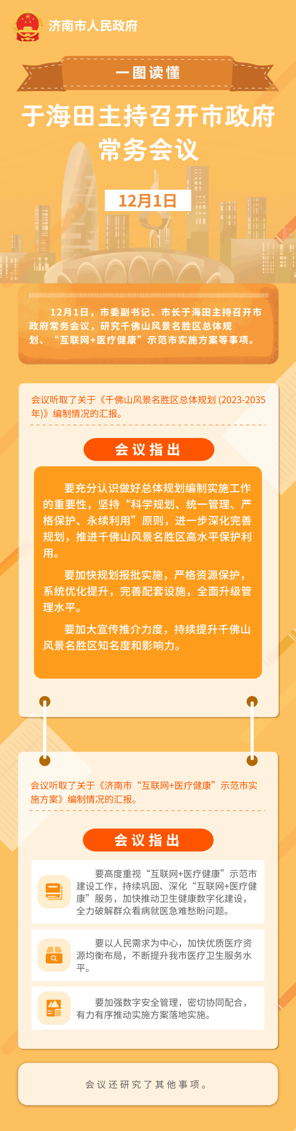 12月1日,市委副書記、市長于海田主持召開市政府常務(wù)會議,研究千佛山風(fēng)景名勝區(qū)總體規(guī)劃、“互聯(lián)網(wǎng)+醫(yī)療健康”示范市實施方案等事項。