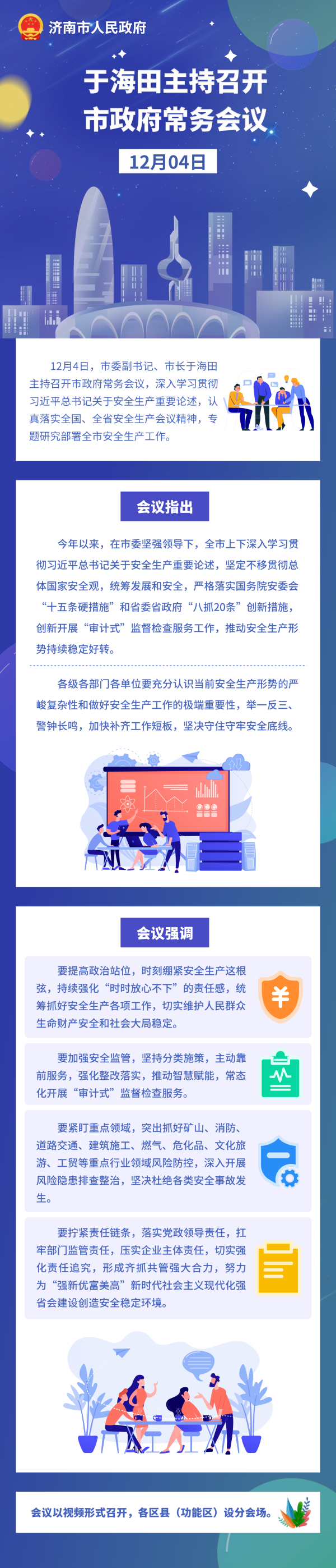 12月4日,市委副書(shū)記、市長(zhǎng)于海田主持召開(kāi)市政府常務(wù)會(huì)議,深入學(xué)習(xí)貫徹習(xí)近平總書(shū)記關(guān)于安全生產(chǎn)重要論述,認(rèn)真落實(shí)全國(guó)、全省安全生產(chǎn)會(huì)議精神,專題研究部署全市安全生產(chǎn)工作。
