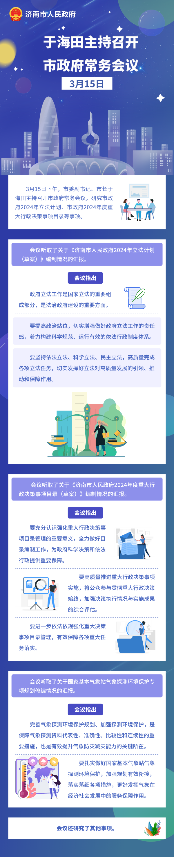 會(huì)議聽(tīng)取了關(guān)于《濟(jì)南市人民政府2024年立法計(jì)劃(草案)》編制情況的匯報(bào)。會(huì)議指出,政府立法工作是國(guó)家立法的重要組成部分,是法治政府建設(shè)的重要方面。要提高政治站位,切實(shí)增強(qiáng)做好政府立法工作的責(zé)任感,著力構(gòu)建科學(xué)規(guī)范、運(yùn)行有效的依法行政制度體系。要堅(jiān)持依法立法、科學(xué)立法、民主立法,高質(zhì)量完成各項(xiàng)立法任務(wù),切實(shí)發(fā)揮好立法對(duì)高質(zhì)量發(fā)展的引領(lǐng)、推動(dòng)和保障作用。