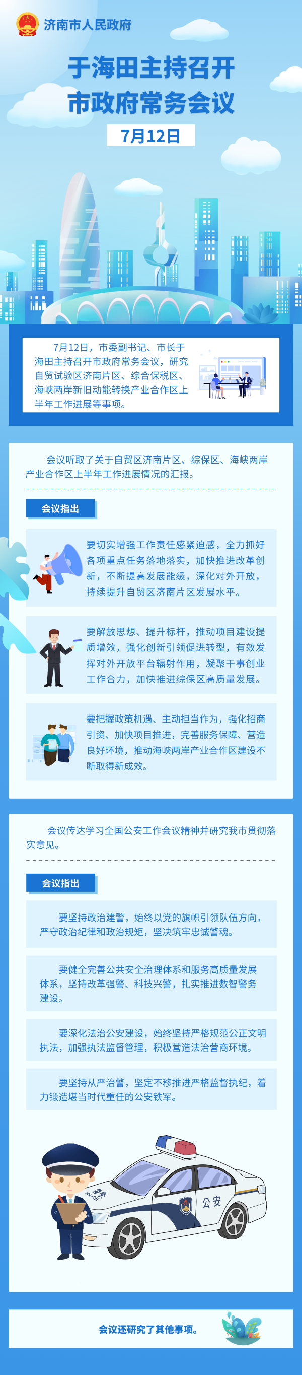 7月12日,市委副書記、市長(zhǎng)于海田主持召開市政府常務(wù)會(huì)議,研究自貿(mào)試驗(yàn)區(qū)濟(jì)南片區(qū)、綜合保稅區(qū)、海峽兩岸新舊動(dòng)能轉(zhuǎn)換產(chǎn)業(yè)合作區(qū)上半年工作進(jìn)展等事項(xiàng)。