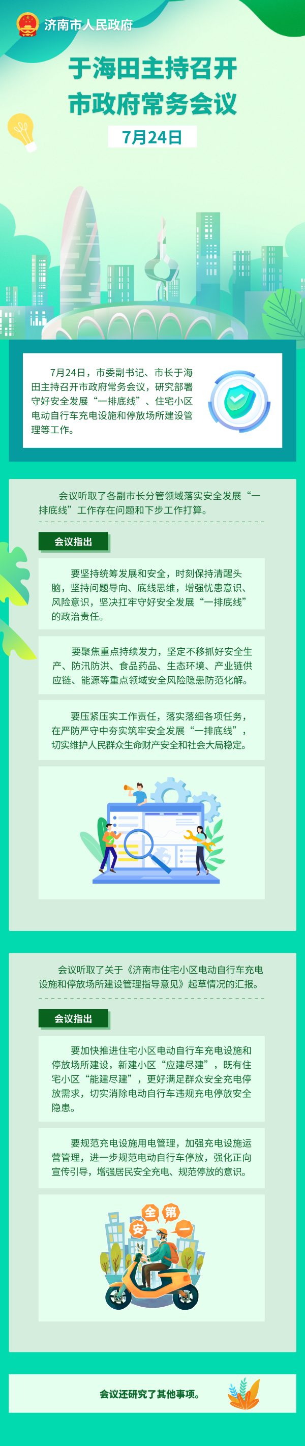 7月24日,市委副書記、市長(zhǎng)于海田主持召開市政府常務(wù)會(huì)議,研究部署守好安全發(fā)展“一排底線”、住宅小區(qū)電動(dòng)自行車充電設(shè)施和停放場(chǎng)所建設(shè)管理等工作。