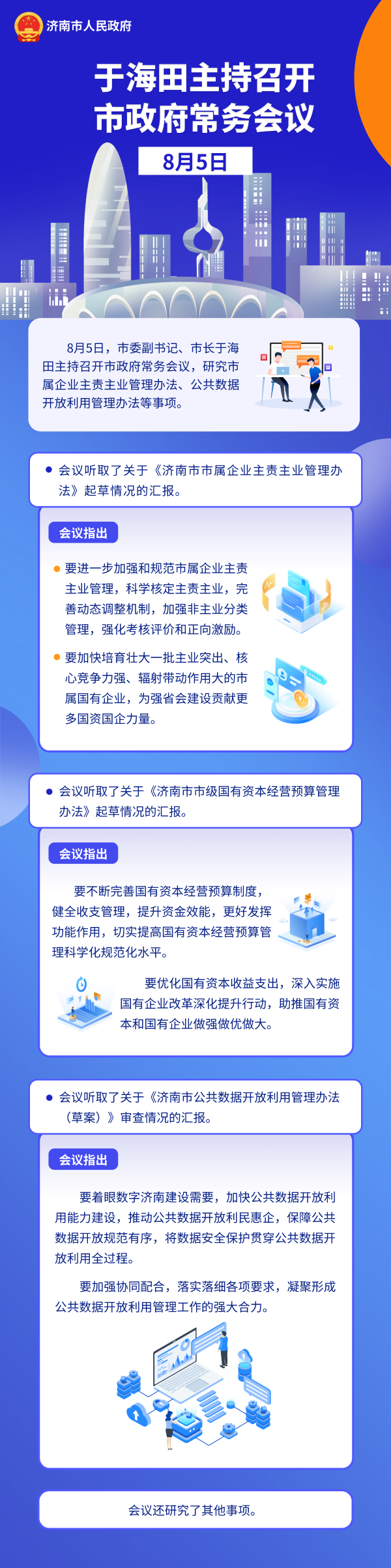 8月5日,市委副書記、市長于海田主持召開市政府常務會議,研究市屬企業(yè)主責主業(yè)管理辦法、公共數據開放利用管理辦法等事項。