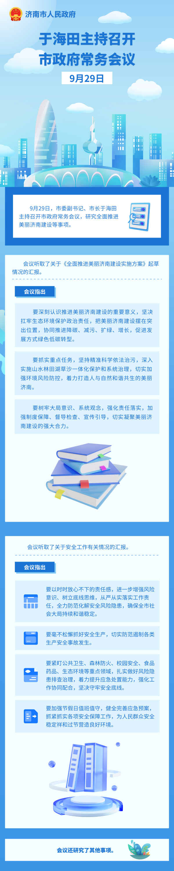 9月29日,市委副書記、市長于海田主持召開市政府常務會議,研究全面推進美麗濟南建設等事項。
