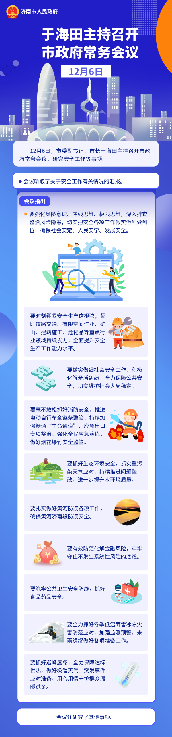 會(huì)議聽取了關(guān)于安全工作有關(guān)情況的匯報(bào)。會(huì)議指出,要強(qiáng)化風(fēng)險(xiǎn)意識(shí)、底線思維、極限思維,深入排查整治風(fēng)險(xiǎn)隱患,切實(shí)把安全各項(xiàng)工作做實(shí)做細(xì)做到位,確保社會(huì)安定、人民安寧、發(fā)展安全。要時(shí)刻繃緊安全生產(chǎn)這根弦,緊盯道路交通、有限空間作業(yè)、礦山、建筑施工、?;返戎攸c(diǎn)行業(yè)領(lǐng)域持續(xù)發(fā)力,全面提升安全生產(chǎn)工作能力水平。要做實(shí)做細(xì)社會(huì)安全工作,積極化解矛盾糾紛,全力保障公共安全,切實(shí)維護(hù)社會(huì)大局穩(wěn)定。要毫不放松抓好消防安全,推進(jìn)電動(dòng)自行車全鏈條整治,持續(xù)加強(qiáng)暢通“生命通道”、應(yīng)急出口專項(xiàng)整治,強(qiáng)化全民應(yīng)急演練,做好煙花爆竹安全監(jiān)管。要抓好生態(tài)環(huán)境安全,抓實(shí)重污染天氣應(yīng)對(duì),持續(xù)推進(jìn)問題整改,進(jìn)一步提升水環(huán)境質(zhì)量。要扎實(shí)做好黃河防凌各項(xiàng)工作,確保黃河濟(jì)南段防凌安全。要有效防范化解金融風(fēng)險(xiǎn),牢牢守住不發(fā)生系統(tǒng)性風(fēng)險(xiǎn)的底線。要筑牢公共衛(wèi)生安全防線,抓好食品藥品安全。要全力抓好冬季低溫雨雪冰凍災(zāi)害防范應(yīng)對(duì),加強(qiáng)監(jiān)測(cè)預(yù)警,未雨綢繆做好各項(xiàng)準(zhǔn)備工作。要抓好迎峰度冬,全力保障達(dá)標(biāo)供熱,做好極端天氣、突發(fā)事件應(yīng)對(duì)準(zhǔn)備,用心用情守護(hù)群眾溫暖過冬。