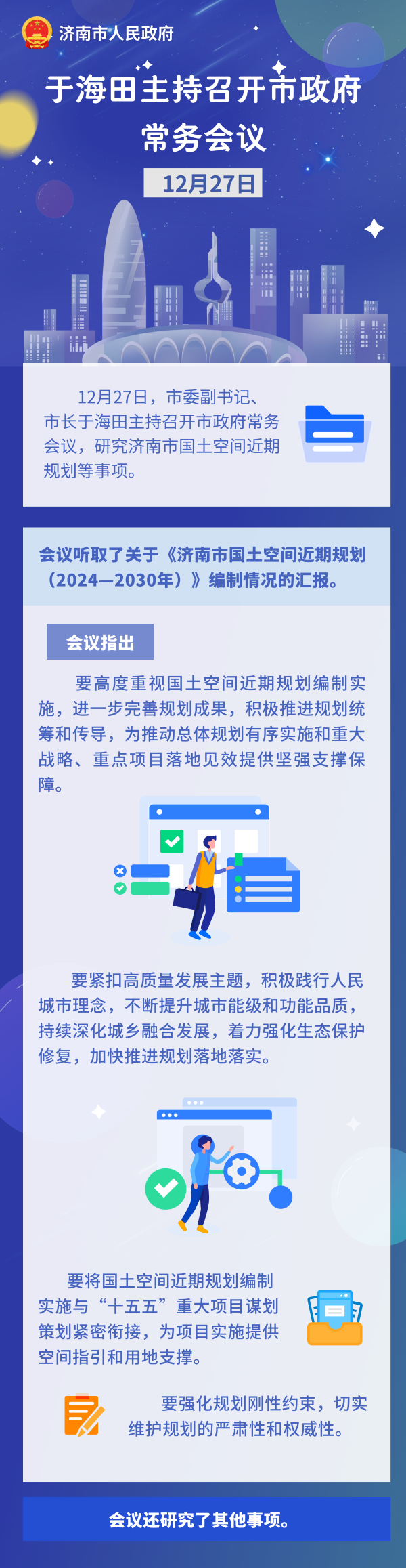 12月27日,市委副書記、市長于海田主持召開市政府常務會議,研究濟南市國土空間近期規(guī)劃等事項。