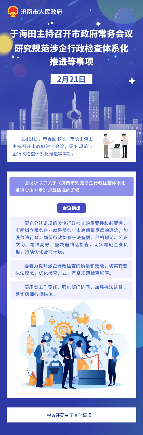 2月21日,市委副書記、市長于海田主持召開市政府常務(wù)會議,研究規(guī)范涉企行政檢查體系化推進等事項。