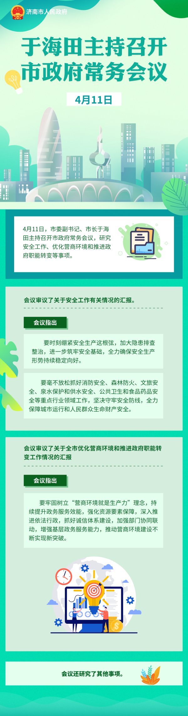 4月11日,市委副書記、市長于海田主持召開市政府常務(wù)會議,研究安全工作、優(yōu)化營商環(huán)境和推進(jìn)政府職能轉(zhuǎn)變等事項。