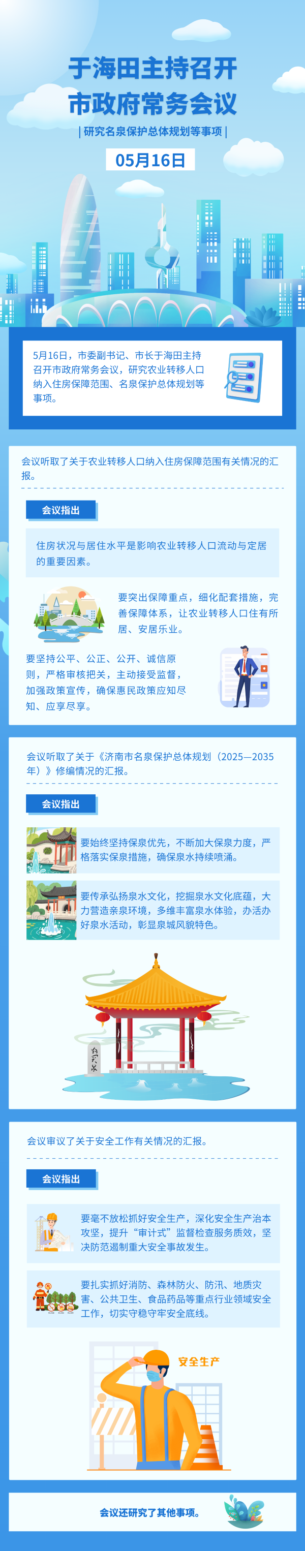 5月16日,市委副書記、市長于海田主持召開市政府常務(wù)會(huì)議,研究農(nóng)業(yè)轉(zhuǎn)移人口納入住房保障范圍、名泉保護(hù)總體規(guī)劃等事項(xiàng)。