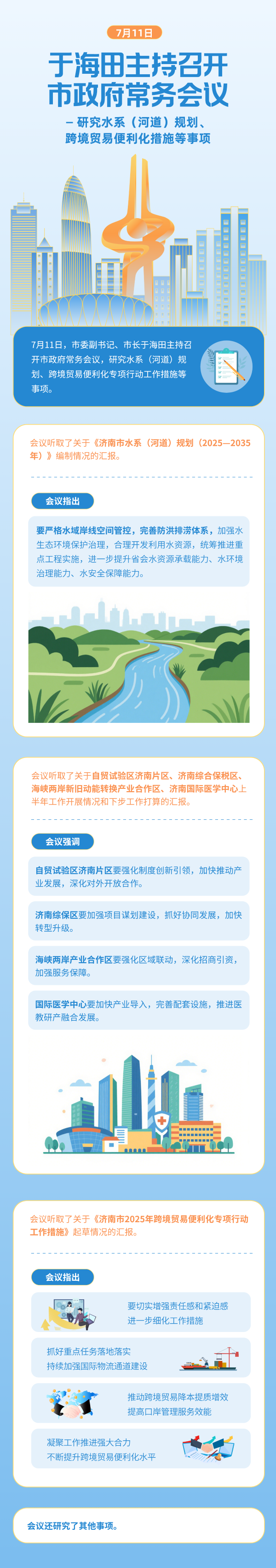 7月11日,市委副書記、市長于海田主持召開市政府常務(wù)會議,研究水系(河道)規(guī)劃、跨境貿(mào)易便利化專項行動工作措施等事項。