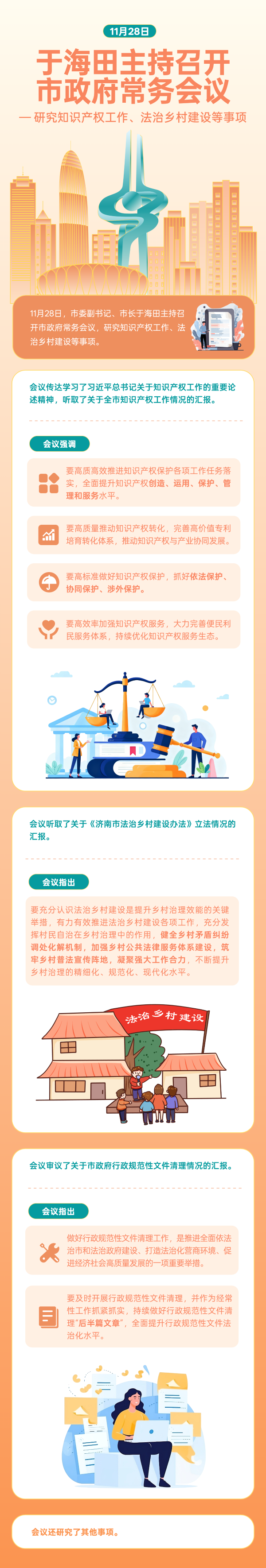 11月28日,市委副書記、市長于海田主持召開市政府常務(wù)會議,研究知識產(chǎn)權(quán)工作、法治鄉(xiāng)村建設(shè)等事項。