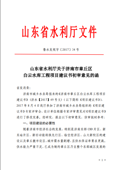 2017年9月6日,山東省水利廳以“魯水發(fā)規(guī)字[2017]34號”向山東省發(fā)展和改革委員會出具了關(guān)于白云水庫工程項目建議書初審意見的函。