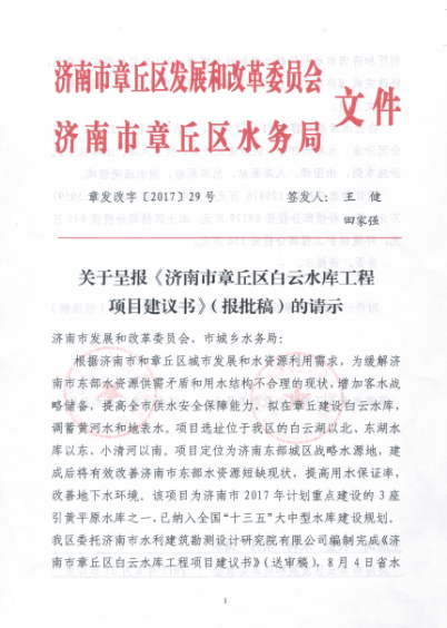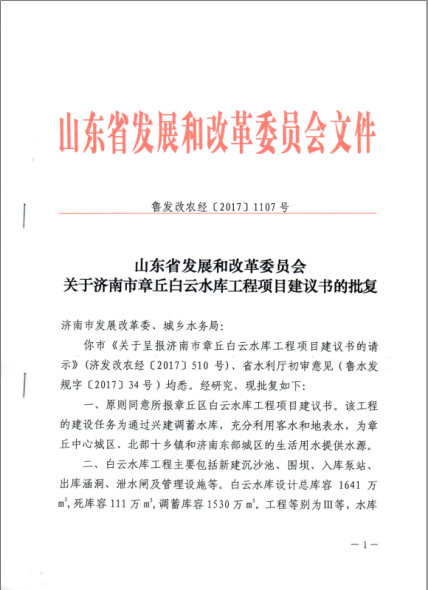 2017年9月25日,山東省發(fā)展和改革委員會以“魯發(fā)改農(nóng)經(jīng)[2017]1107號”下達(dá)了《關(guān)于濟南市章丘白云水庫項目建議書的批復(fù)》。