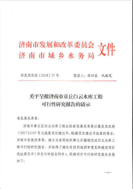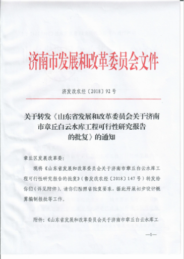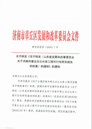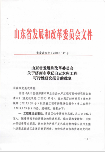 2018年1月31日,山東省發(fā)展和改革委員會(huì)以“魯發(fā)改農(nóng)經(jīng)[2018]147號(hào)”文,對(duì)工程可行性研究報(bào)告進(jìn)行了批復(fù);2018年2月7日濟(jì)南市發(fā)展和改革委員會(huì)、2018年2月11日濟(jì)南市章丘區(qū)發(fā)展和改革委員會(huì)對(duì)批復(fù)文件進(jìn)行轉(zhuǎn)發(fā)。