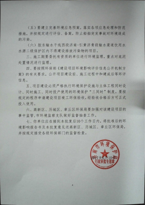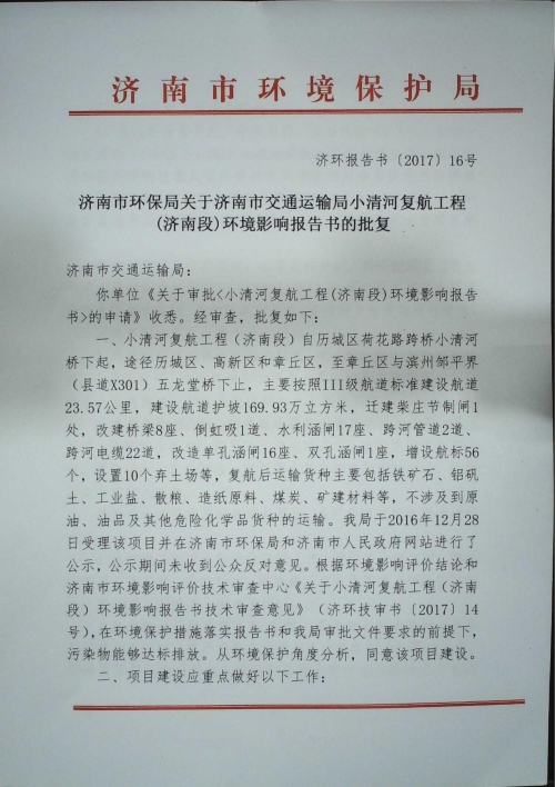 濟(jì)南市環(huán)保局關(guān)于濟(jì)南市交通運(yùn)輸局小清河復(fù)航工程(濟(jì)南段)環(huán)境影響報告書的批復(fù)