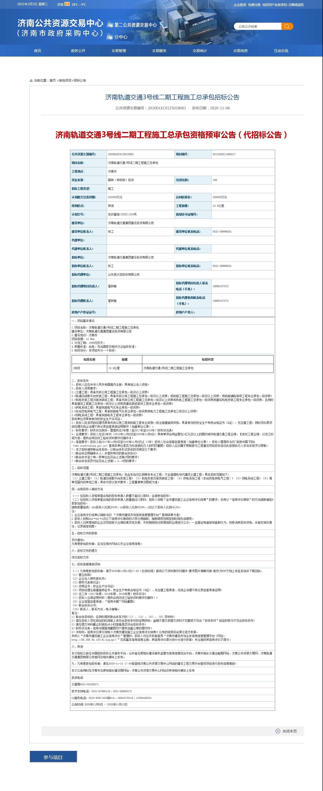 濟(jì)南軌道交通3號(hào)線二期工程施工總承包招標(biāo)公告 發(fā)布日期:2021-12-13 11:12 信息來源:濟(jì)南市政府門戶網(wǎng)站 瀏覽次數(shù):次 字體:【 默認(rèn) 大 超大 】 【打印本頁】 【關(guān)閉窗口】