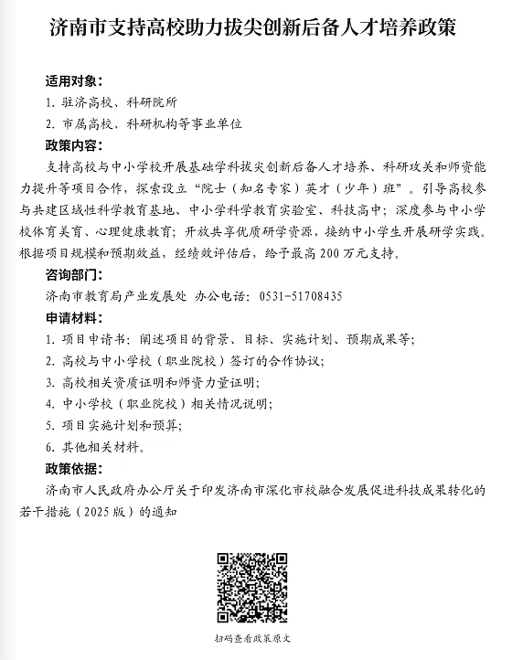 △濟(jì)南市支持高校助力拔尖創(chuàng)新后備人才培養(yǎng)政策 發(fā)布日期:2025-06-16 10:19 信息來源:濟(jì)南市投資促進(jìn)局 瀏覽次數(shù):次 字體:【 默認(rèn) 大 超大 】 【打印本頁】 【關(guān)閉窗口】